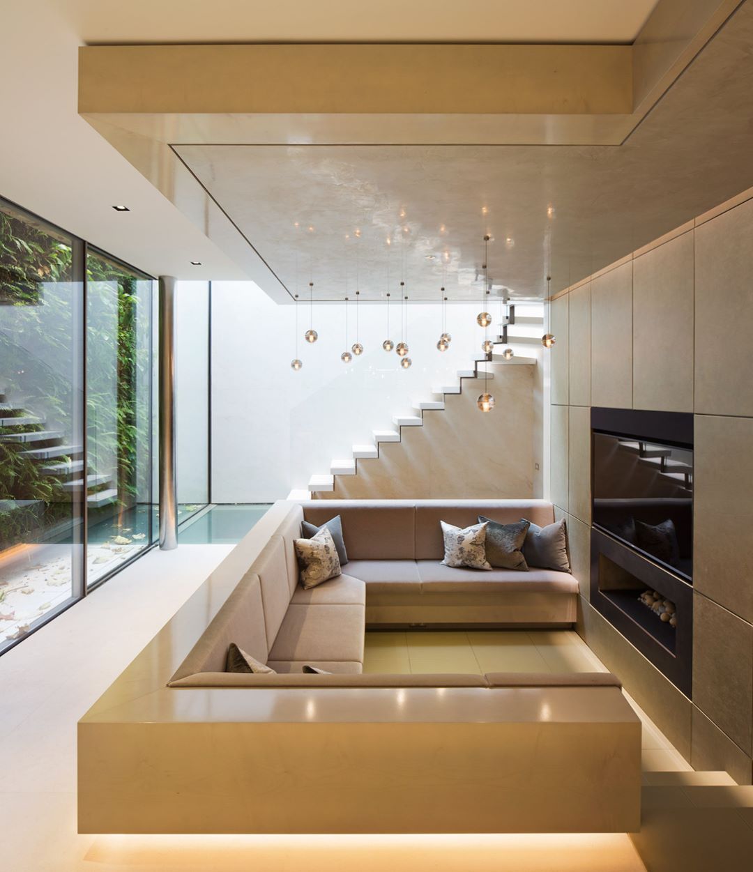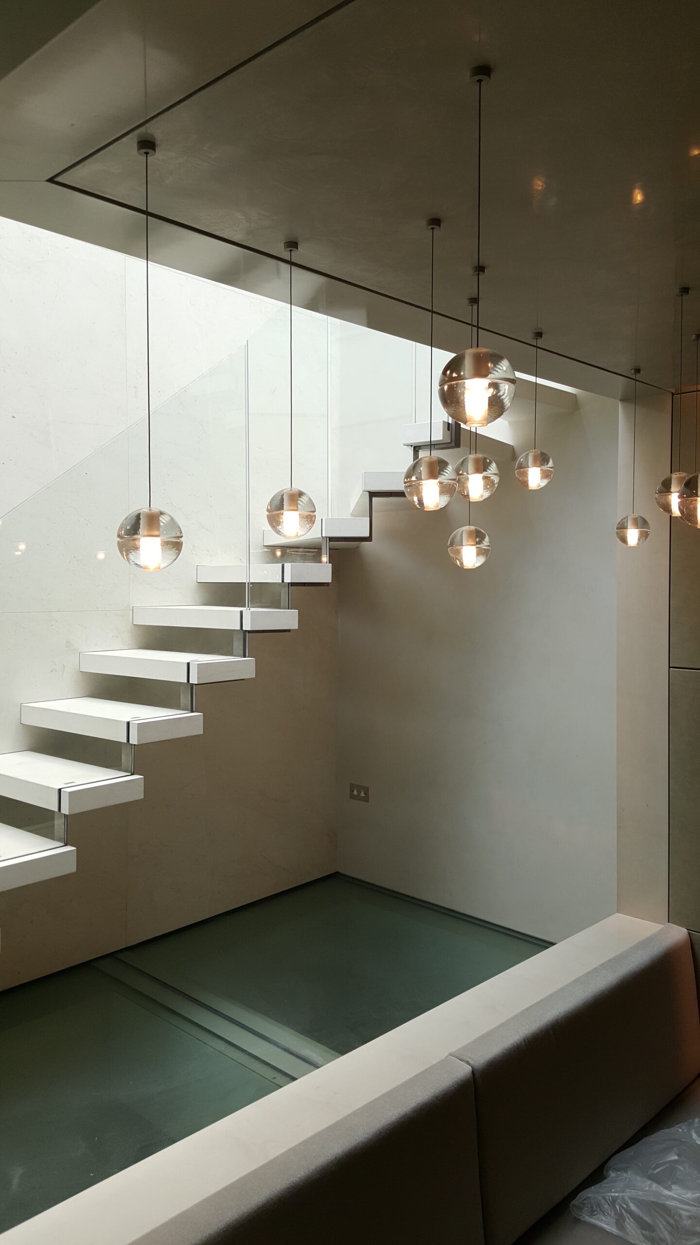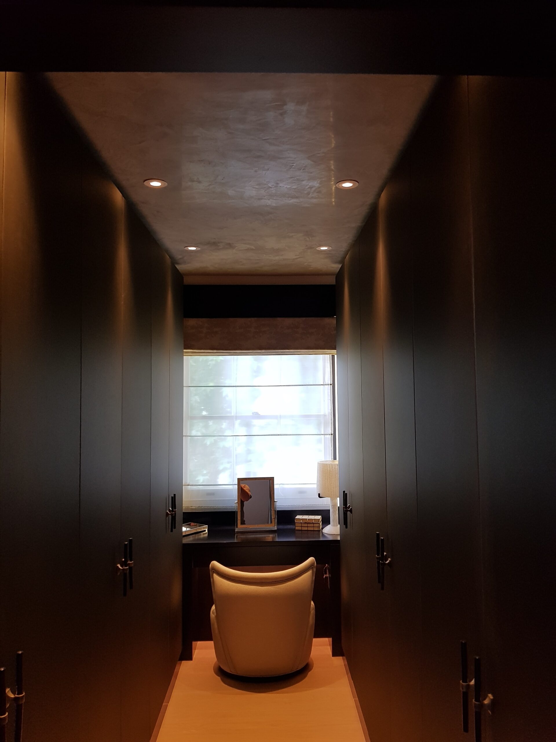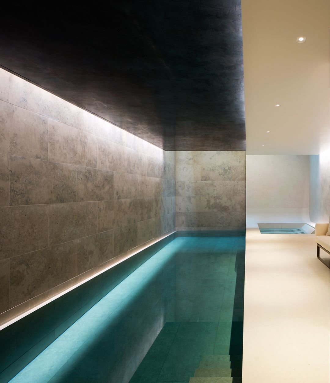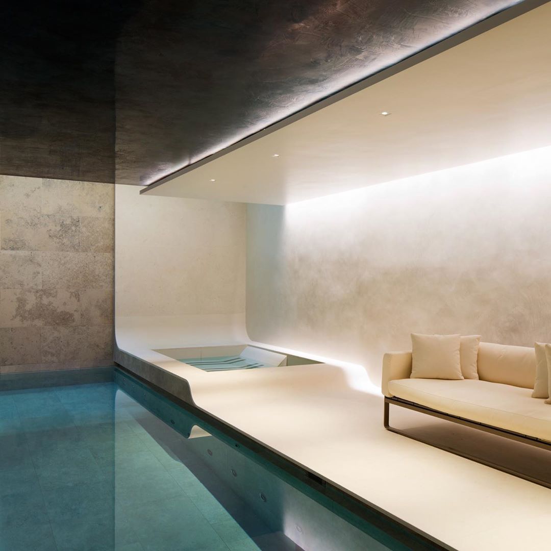 We used several different finishes within this project in different spaces, making a electric mix of design including the pool ceiling.