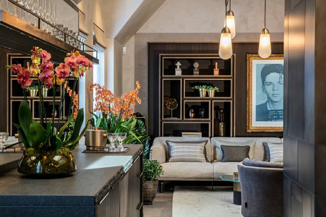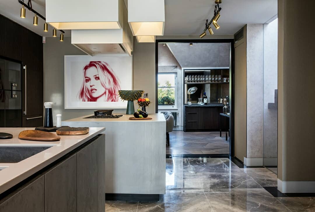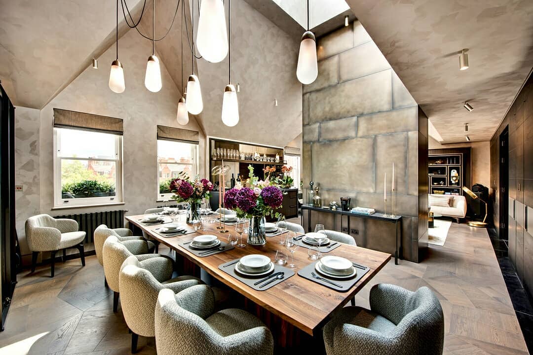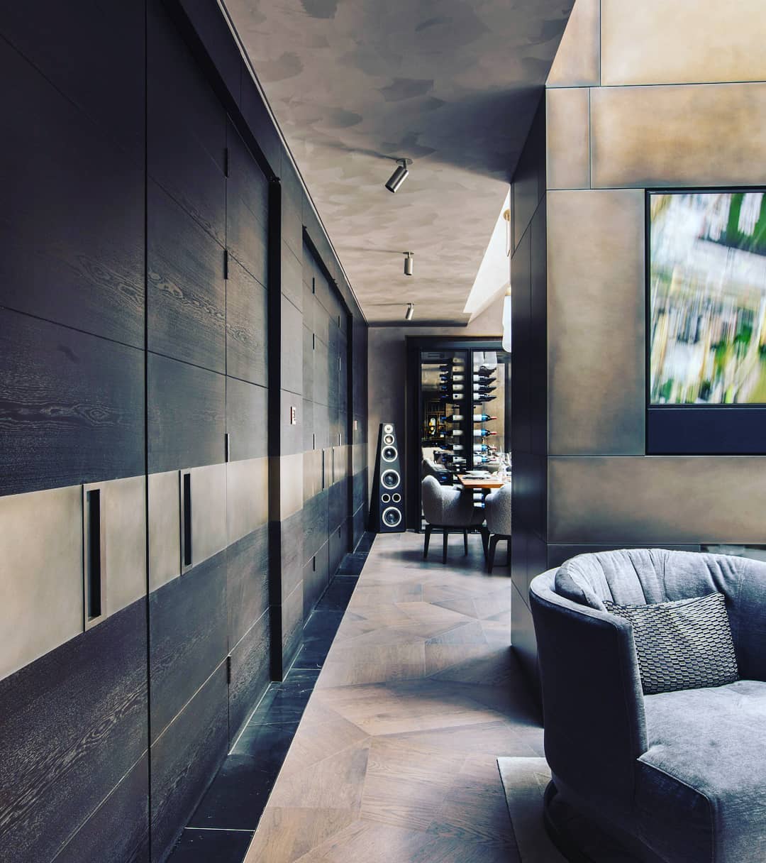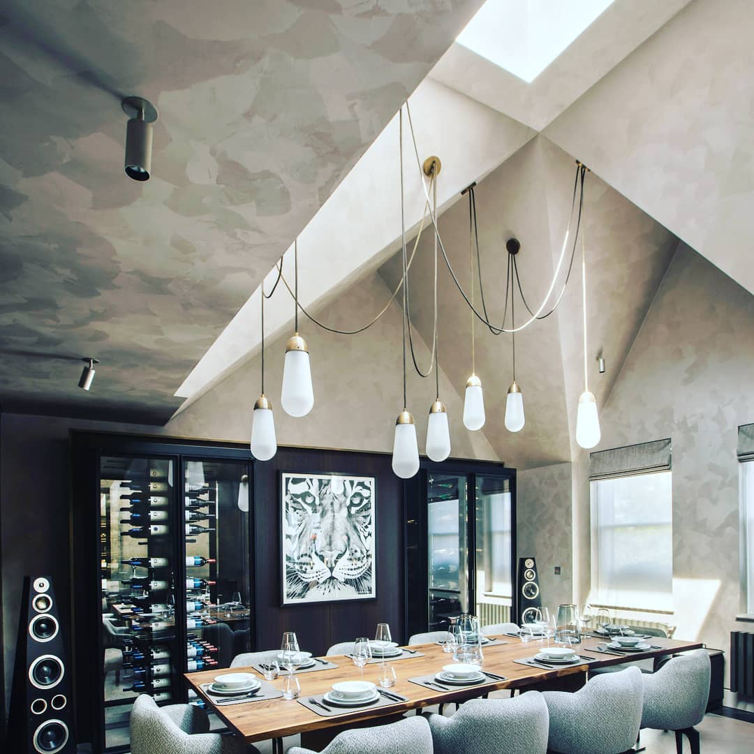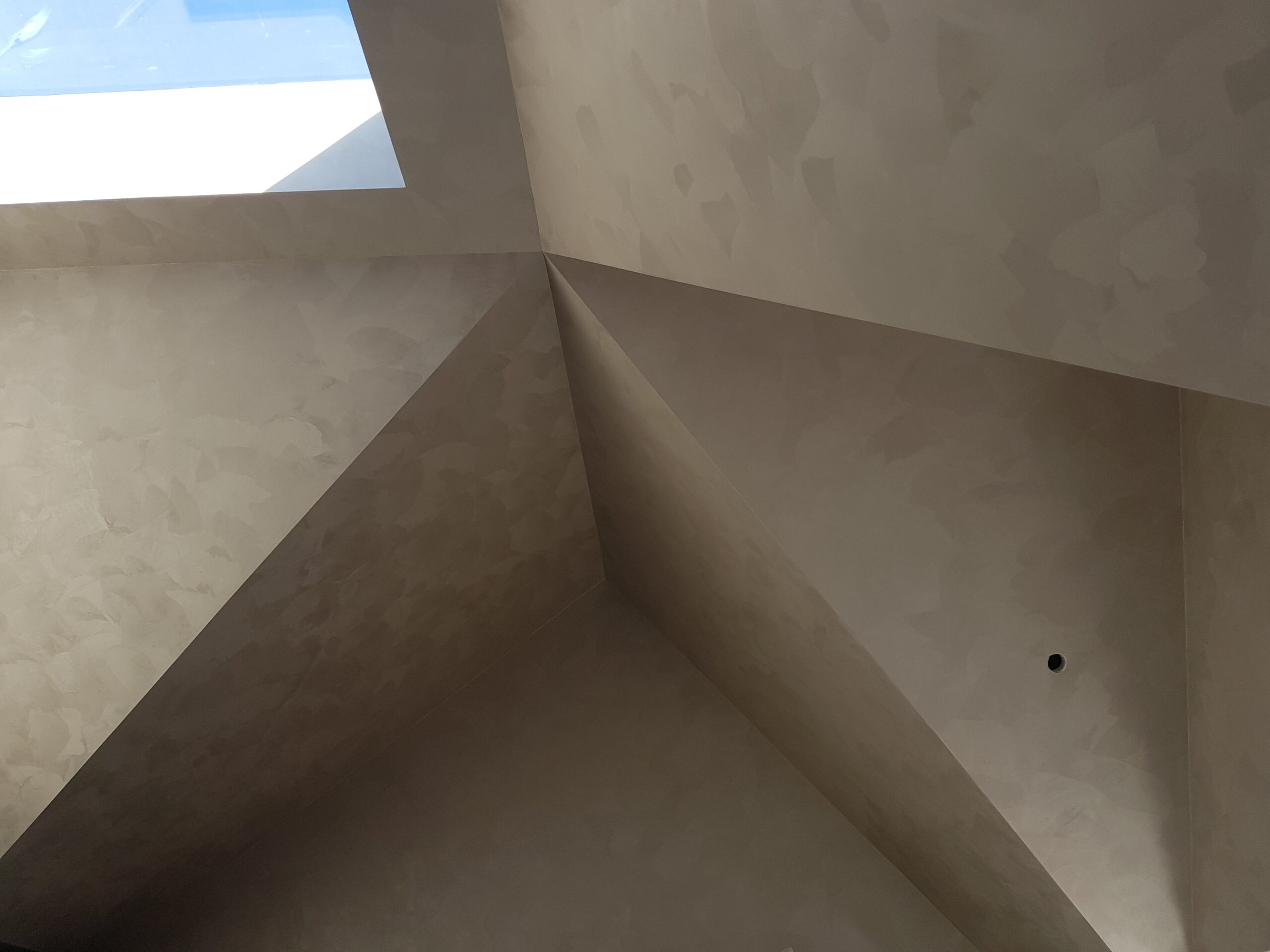 The use of our AMS metallic finish on this unusual ceiling shape creating shadows and reflections that heighten this space. Pelago was used on the stairs up to the roof terrace.