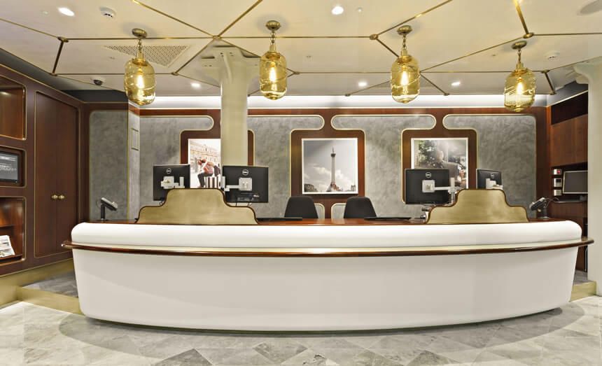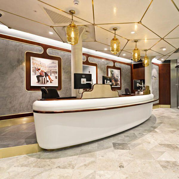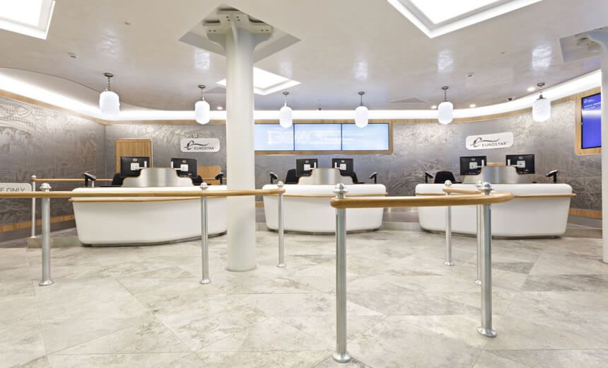After being specified to do the grey polished plaster stucco finish to the walls in the business lounge and ticket office, we were asked to put a pure white stucco finish on the ceiling. This has given the spaces a brilliant reflective feel and given light to what might have been a difficult space.
